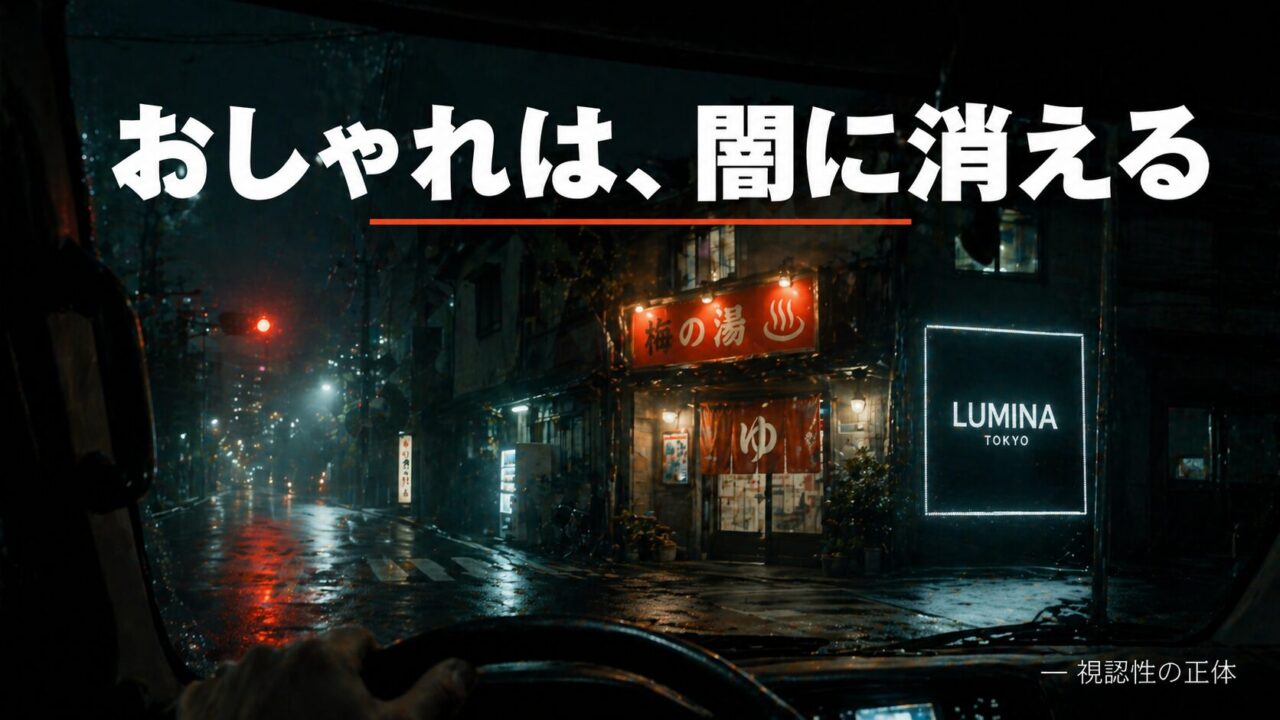 真っ暗な道で、頭は半分夢の中。そんな状態で「おしゃれで繊細な看板」なんて目に入るわけがない。0.1秒、0.2秒。そこで脳に届かない情報は「存在しない」のと同じです。
